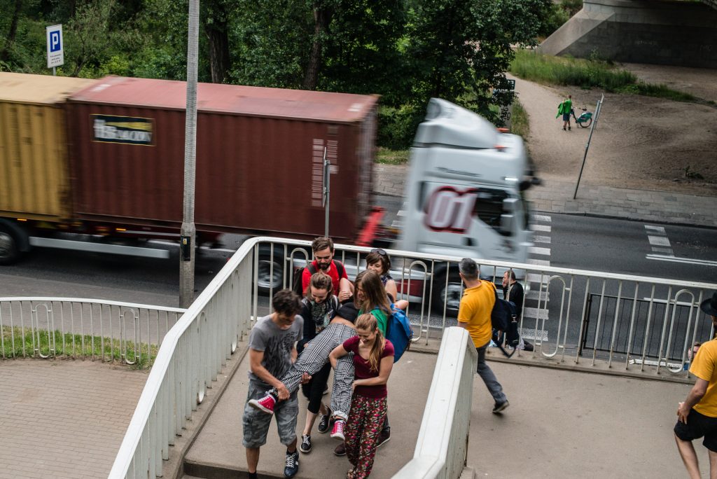 Odkrywaliśmy przestrzeń miejską Warszawy na nowo. Wykorzystaliśmy nasze wszystkie zmysły – wzrok, słuch, dotyk, smak, itd. aby zbadać ulice, bramy, podwórka Warszawskiej Pragi i pozwolić im przemówić przez nasze ciała.